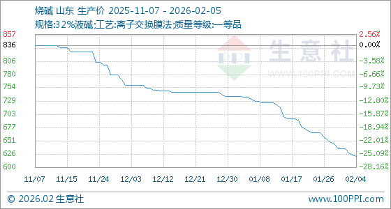2月5日,生意社烧碱基准价为622.00元/吨,与本月初(636.00元/吨)相比,下降了2.2%。