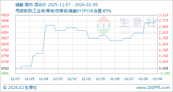 2月5日,生意社磷酸基准价为6900.00元/吨,与本月初(6890.00元/吨)相比,上涨了0.15%。