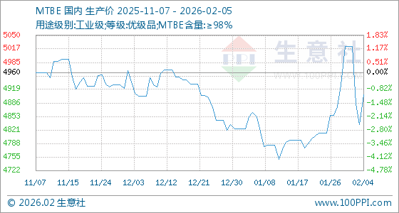 2月5日,生意社MTBE基准价为4906.67元/吨,与本月初(5023.33元/吨)相比,下降了2.32%。