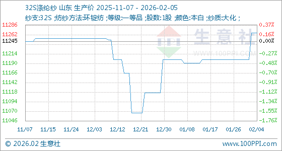 2月5日,生意社32S涤纶纱基准价为11266.67元/吨,与本月初(11200.00元/吨)相比,上涨了0.60%。