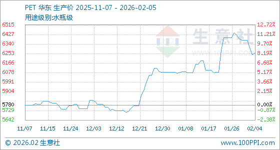 2月5日,生意社PET基准价为6262.50元/吨,与本月初(6375.00元/吨)相比,下降了1.76%。