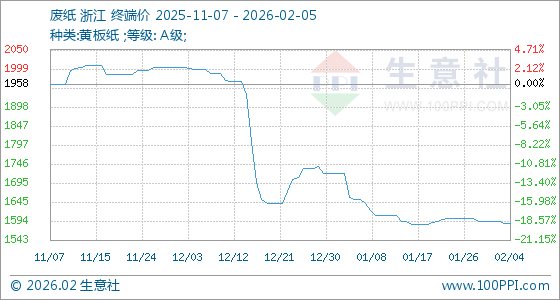 2月5日,生意社废纸基准价为1588.00元/吨,与本月初(1592.00元/吨)相比,下降了0.25%。