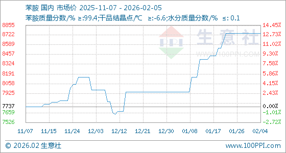 2月5日,生意社苯胺基准价为8745.00元/吨,与本月初持平。
