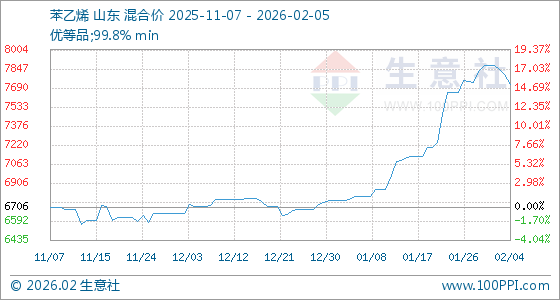 2月5日,生意社苯乙烯基准价为7720.00元/吨,与本月初(7874.00元/吨)相比,下降了1.96%。