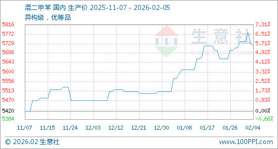 2月5日,生意社混二甲苯基准价为5720.00元/吨,与本月初(5740.00元/吨)相比,下降了0.35%。