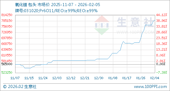 2月5日,生意社氧化镨基准价为790000.00元/吨,与本月初(765000.00元/吨)相比,上涨了3.27%。