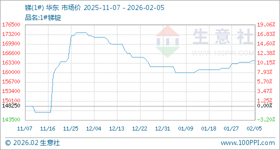 2月5日,生意社锑(1#)基准价为164000.00元/吨,与本月初(163500.00元/吨)相比,上涨了0.31%。