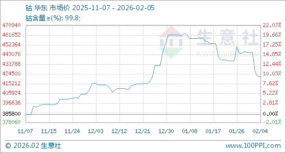 2月5日,生意社钴基准价为421800.00元/吨,与本月初(444800.00元/吨)相比,下降了5.17%。