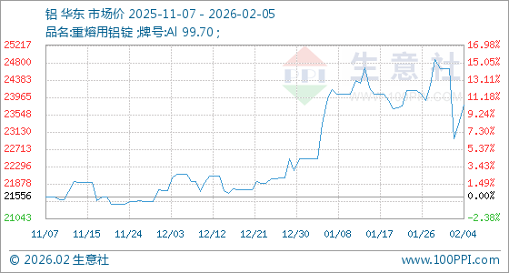 2月5日,生意社铝基准价为23780.00元/吨,与本月初(24666.67元/吨)相比,下降了3.59%。