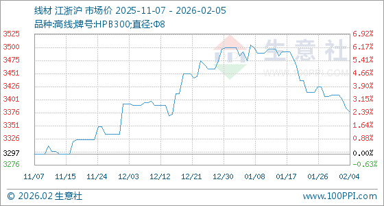2月5日,生意社线材基准价为3377.50元/吨,与本月初(3410.00元/吨)相比,下降了0.95%。