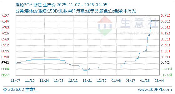 2月5日,生意社涤纶POY基准价为7150.00元/吨,与本月初持平。