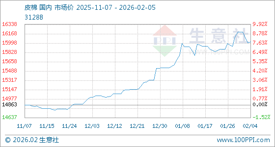 2月5日,生意社皮棉基准价为16016.33元/吨,与本月初(16196.50元/吨)相比,下降了1.11%。