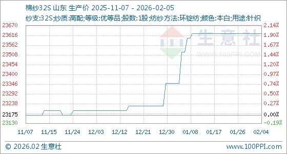 2月5日,生意社棉纱32S基准价为23625.00元/吨,与本月初持平。