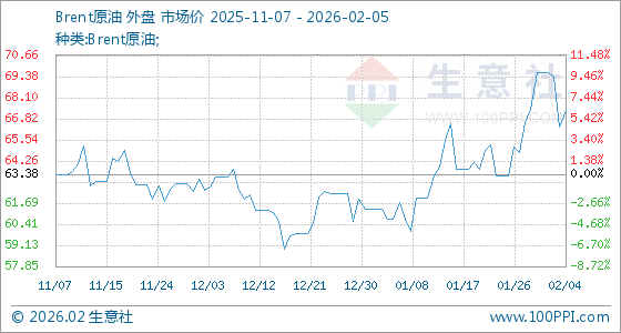 2月5日,生意社Brent原油基准价为67.33美元/桶,与本月初(69.59美元/桶)相比,下降了3.25%。
