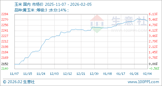 2月5日,生意社玉米基准价为2267.14元/吨,与本月初(2271.43元/吨)相比,下降了0.19%。
