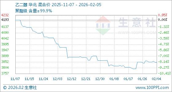 2月5日,生意社乙二醇基准价为3848.33元/吨,与本月初(3850.00元/吨)相比,下降了0.04%。