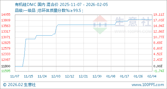 2月5日,生意社有机硅DMC基准价为13850.00元/吨,与本月初持平。