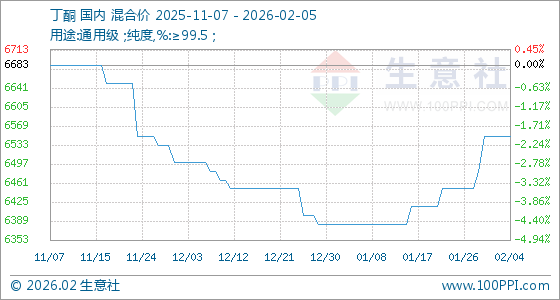 2月5日,生意社丁酮基准价为6550.00元/吨,与本月初持平。