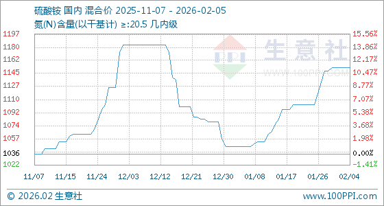 2月5日,生意社硫酸铵基准价为1153.33元/吨,与本月初持平。