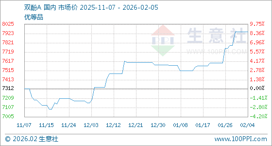 2月5日,生意社双酚A基准价为7940.00元/吨,与本月初持平。