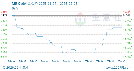 2月5日,生意社MIBK基准价为7266.67元/吨,与本月初持平。