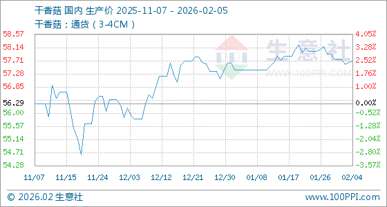 2月5日,生意社干香菇基准价为57.69元/公斤,与本月初(57.74元/公斤)相比,下降了0.09%。