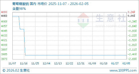 2月5日,生意社葡萄糖酸钠基准价为3983.33元/吨,与本月初持平。