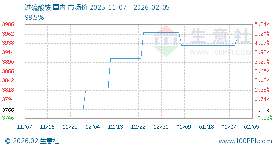 2月5日,生意社过硫酸铵基准价为3950.00元/吨,与本月初持平。
