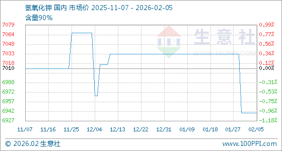 2月5日,生意社氢氧化钾基准价为6940.00元/吨,与本月初持平。