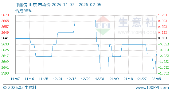 2月5日,生意社甲酸钠基准价为2600.00元/吨,与本月初(2620.00元/吨)相比,下降了0.76%。
