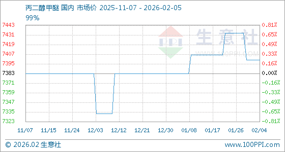2月5日,生意社丙二醇甲醚基准价为7400.00元/吨,与本月初持平。