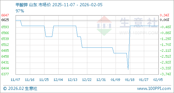 2月5日,生意社甲酸钾基准价为6600.00元/吨,与本月初持平。