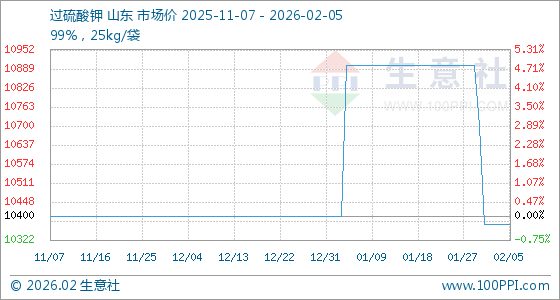 2月5日,生意社过硫酸钾基准价为10375.00元/吨,与本月初持平。