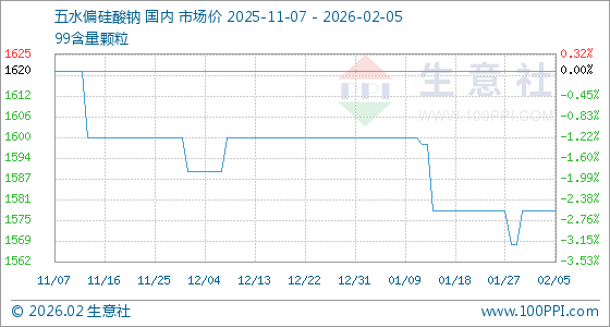 2月5日,生意社五水偏硅酸钠基准价为1578.00元/吨,与本月初持平。