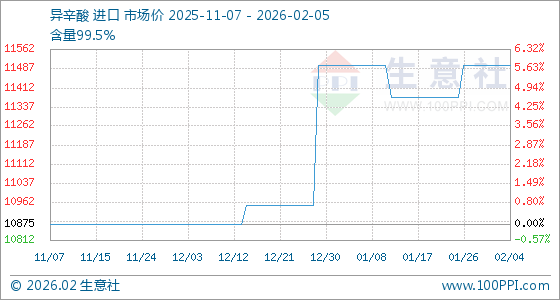 2月5日,生意社异辛酸基准价为11500.00元/吨,与本月初持平。