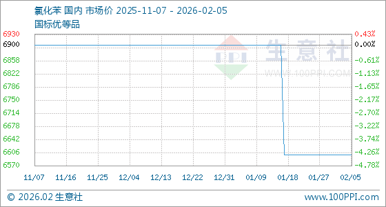 2月5日,生意社氯化苯基准价为6600.00元/吨,与本月初持平。