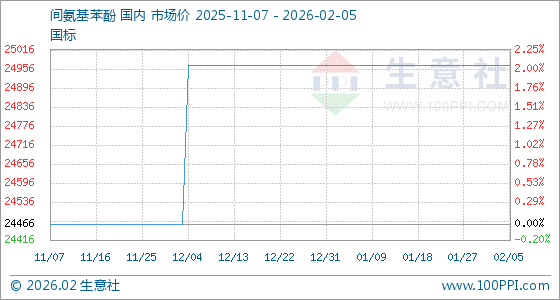 2月5日,生意社间氨基苯酚基准价为24966.67元/吨,与本月初持平。