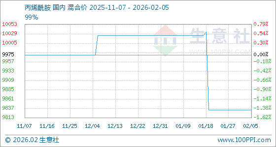 2月5日,生意社丙烯酰胺基准价为9833.33元/吨,与本月初持平。