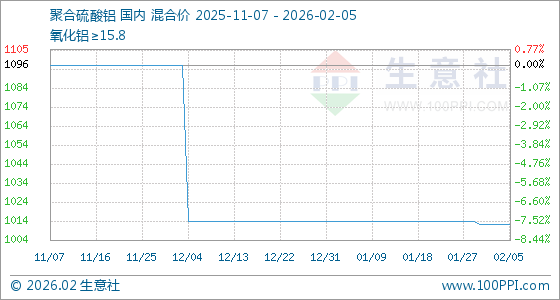 2月5日,生意社聚合硫酸铝基准价为1012.50元/吨,与本月初持平。