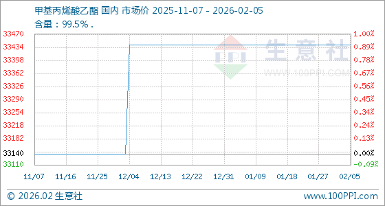 2月5日,生意社甲基丙烯酸乙酯基准价为33440.00元/吨,与本月初持平。