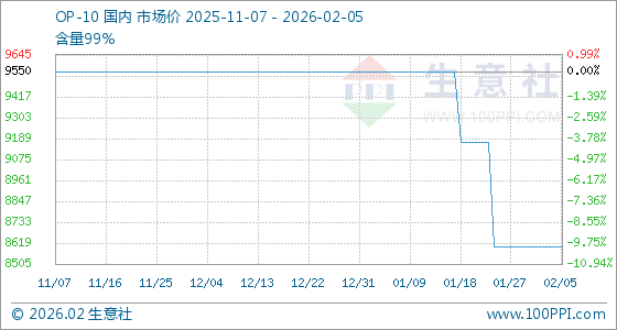 2月5日,生意社OP-10基准价为8600.00元/吨,与本月初持平。