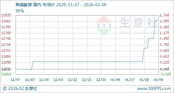 2月5日,生意社焦磷酸钾基准价为11816.67元/吨,与本月初(11750.00元/吨)相比,上涨了0.57%。