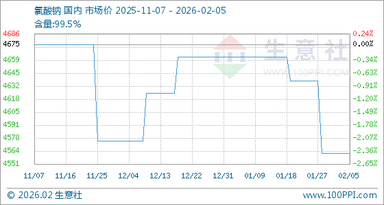 2月5日,生意社氯酸钠基准价为4562.50元/吨,与本月初持平。