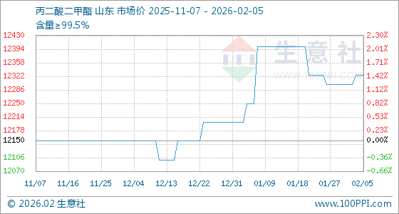 2月5日,生意社丙二酸二甲酯基准价为12325.00元/吨,与本月初(12300.00元/吨)相比,上涨了0.20%。