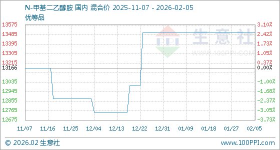 2月5日,生意社N-甲基二乙醇胺基准价为13500.00元/吨,与本月初持平。