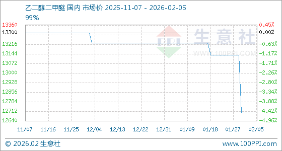 2月5日,生意社乙二醇二甲醚基准价为12700.00元/吨,与本月初持平。