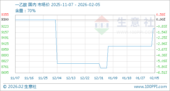 2月5日,生意社一乙胺基准价为9200.00元/吨,与本月初(9000.00元/吨)相比,上涨了2.22%。