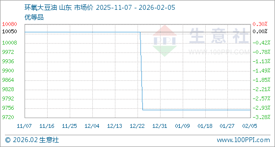 2月5日,生意社环氧大豆油基准价为9750.00元/吨,与本月初持平。