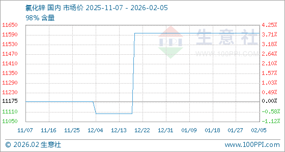 2月5日,生意社氯化锌基准价为11600.00元/吨,与本月初持平。