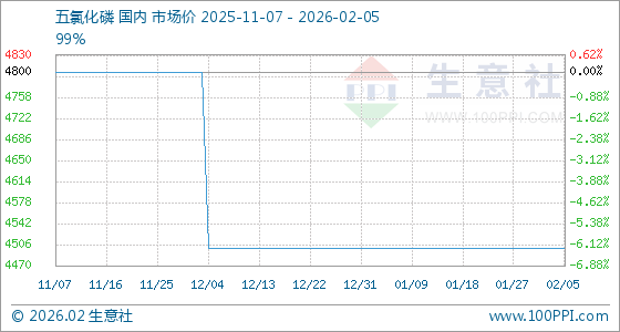2月5日,生意社五氯化磷基准价为4500.00元/吨,与本月初持平。
